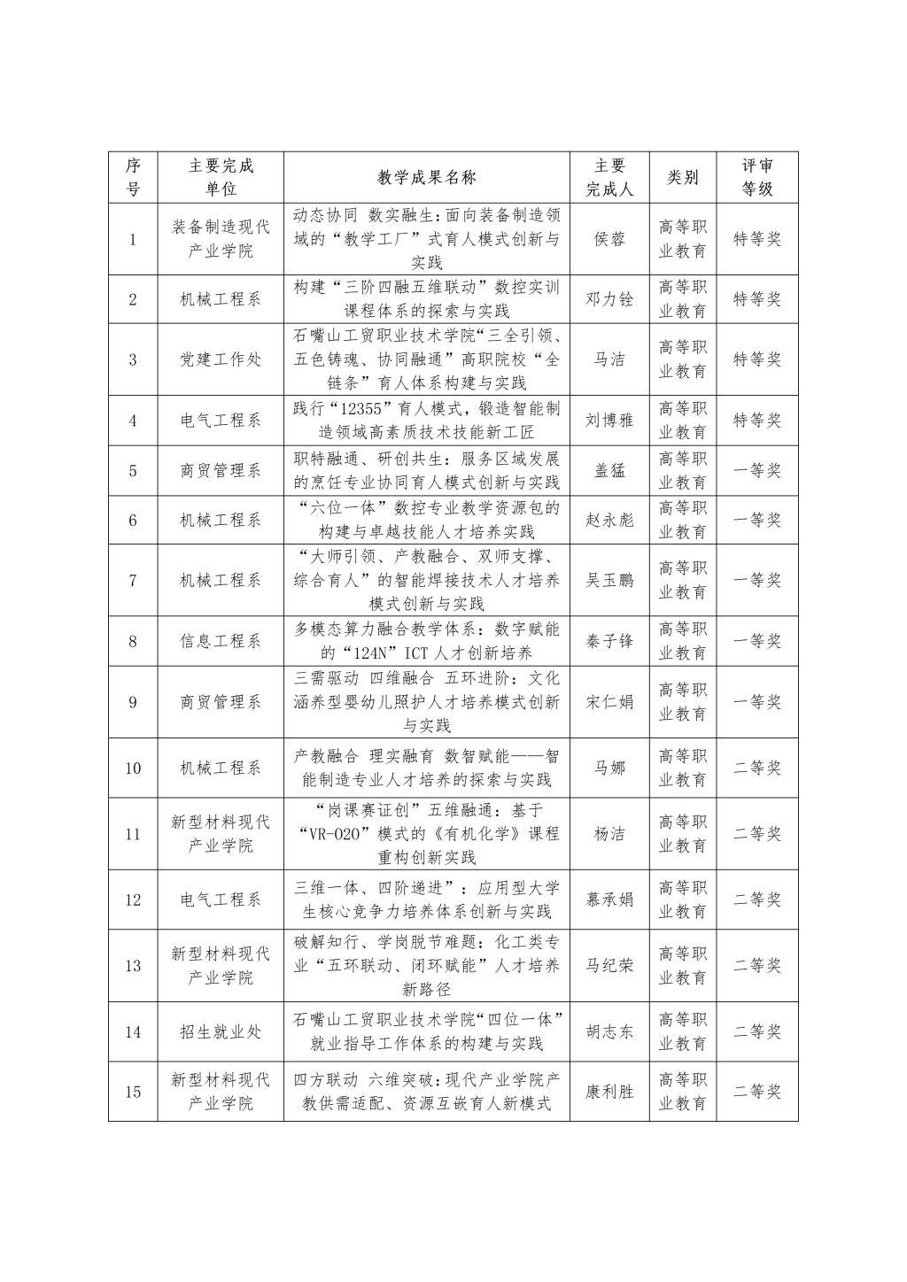 為進(jìn)一步推進(jìn)學(xué)院職業(yè)教育改革,提煉、總結(jié)一批具有創(chuàng)新性、實(shí)踐性和推廣應(yīng)用價(jià)值的教育教學(xué)成果,學(xué)院組織開展了2025年教學(xué)成果獎(jiǎng)評審工作,經(jīng)個(gè)人申報(bào)、各部門推薦、學(xué)院組織專家評選,共評選出2025年石嘴山工貿(mào)職業(yè)技術(shù)學(xué)院校級(jí)教學(xué)成果獎(jiǎng)15項(xiàng),其中特等獎(jiǎng)4項(xiàng),一等獎(jiǎng)5項(xiàng),二等獎(jiǎng)6項(xiàng),現(xiàn)將評選結(jié)果公示如下: