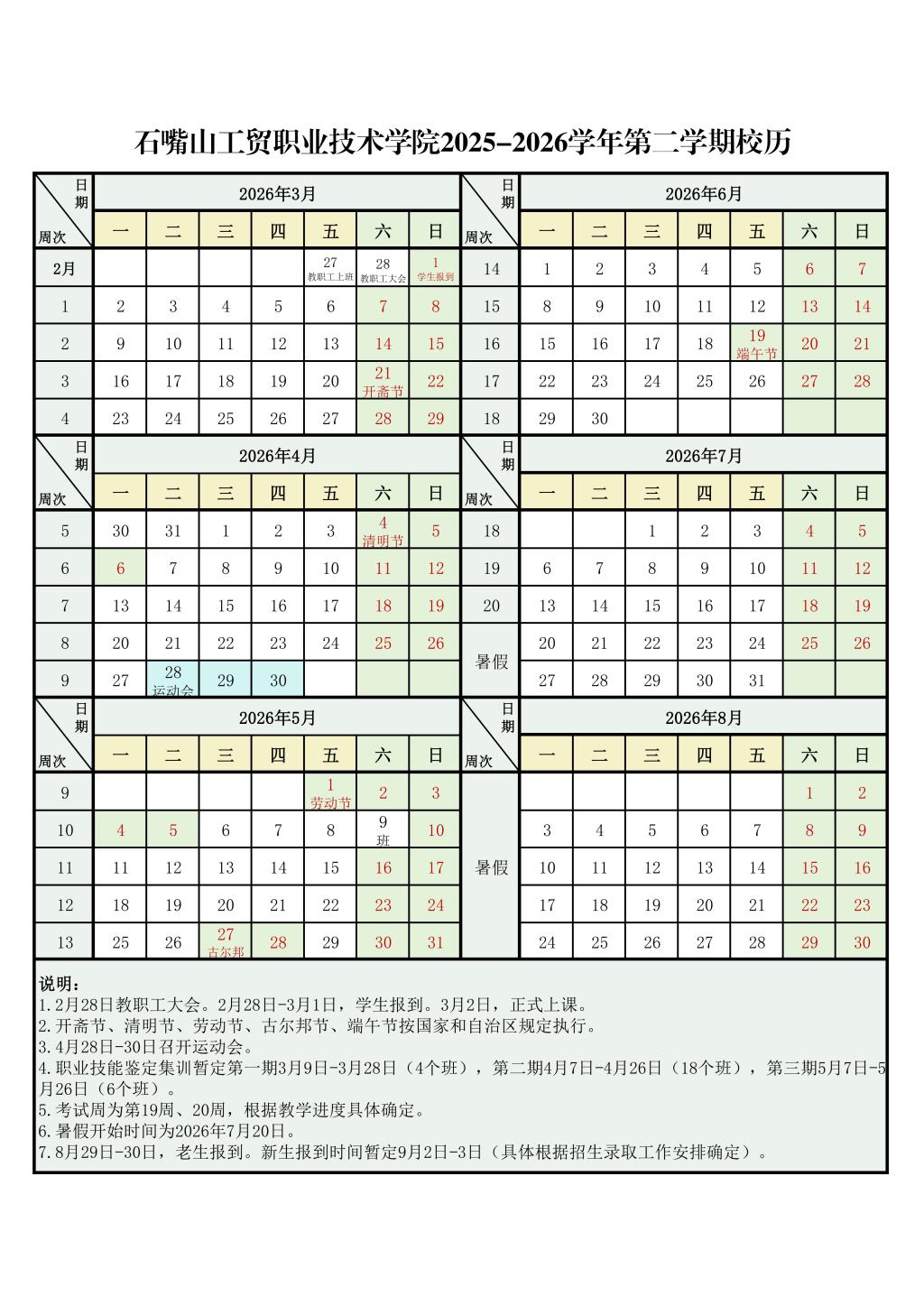 石嘴山工貿(mào)職業(yè)技術(shù)學(xué)院2025-2026學(xué)年第二學(xué)期校歷