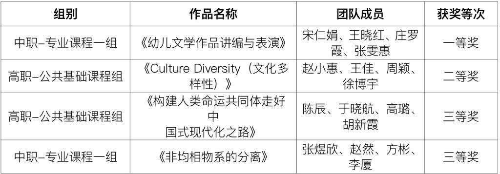 本次比賽成績較往年穩(wěn)中有進,獲獎團隊涉及幼兒保育、化學(xué)工藝2個專業(yè)課程和英語、思想道德與法治2個公共基礎(chǔ)課程。在人員構(gòu)成上,涉及青年教師、骨干教師、雙師型教師以及專業(yè)團隊帶頭人,通過以老帶新的形式,助力青年教師教學(xué)能力再上新臺階。