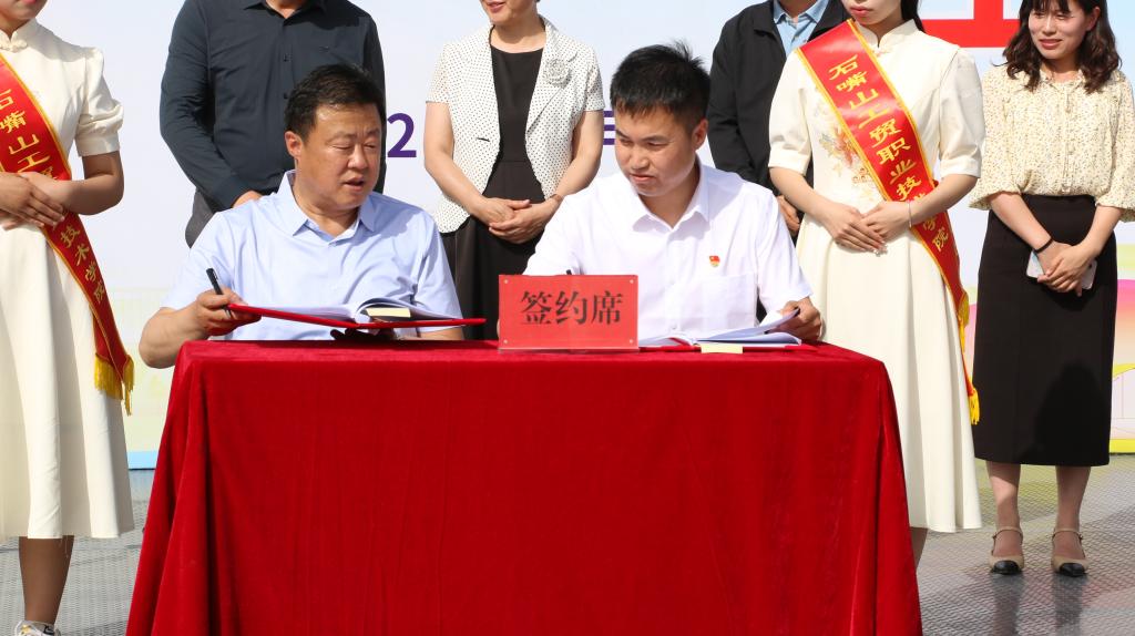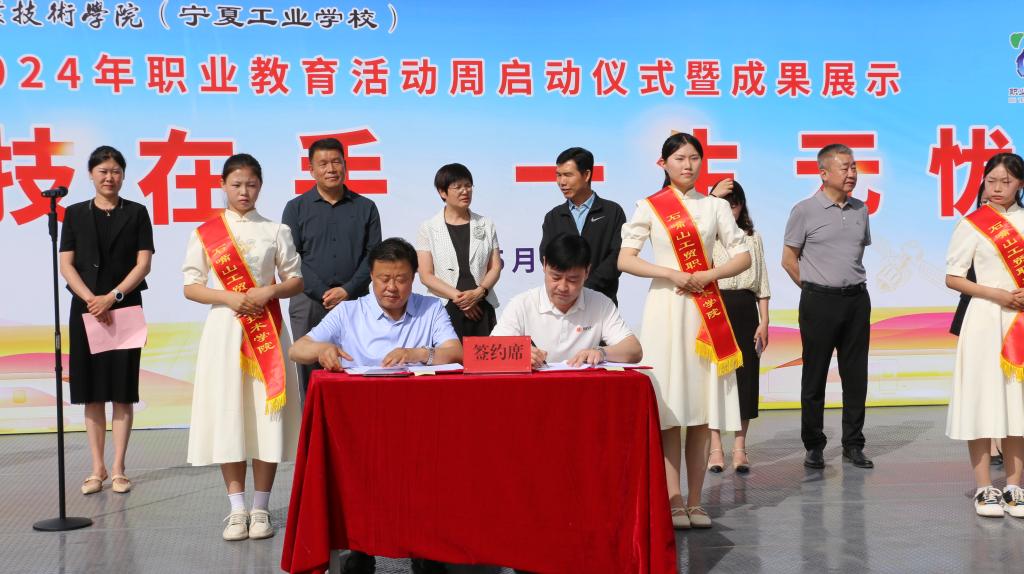 在啟動儀式上,學(xué)院與寧夏晶體新材料有限公司、寧夏中環(huán)光伏材料有限公司、寧夏泰潤數(shù)據(jù)科技有限公司、寧夏夢駝鈴科技有限責(zé)任公司簽訂校企合作協(xié)議。石嘴山市人大常委會副主任劉蘭芳同志為校外實訓(xùn)基地授牌。