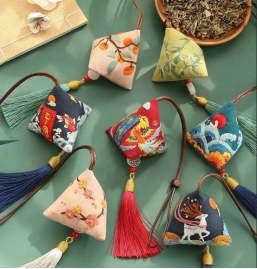 端午節(jié)小孩佩香囊,傳說有避邪驅(qū)瘟之意(古時(shí)人們以為自己發(fā)病是因?yàn)檠Ч砉稚仙恚?,?shí)際是用于襟頭點(diǎn)綴裝飾。香囊內(nèi)有朱砂、雄黃、香藥,外包以絲布,清香四溢,再以五色絲線弦扣成索,做各種不同形狀,結(jié)成一串,形形色色,小巧可愛。端午節(jié),又稱端陽(yáng)節(jié)、龍舟節(jié)、重午節(jié)天中節(jié)等,是集拜神祭祖、祈福辟邪歡慶娛樂和飲食為一體的民俗大節(jié)。與春節(jié)、清明節(jié)、中秋節(jié)并稱為中國(guó)四大傳統(tǒng)節(jié)日。