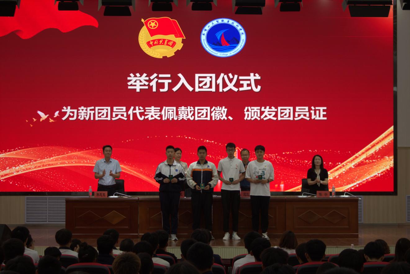 會上舉行了入團儀式,學院領導為新團員代表佩戴團徽、頒發(fā)團員證。