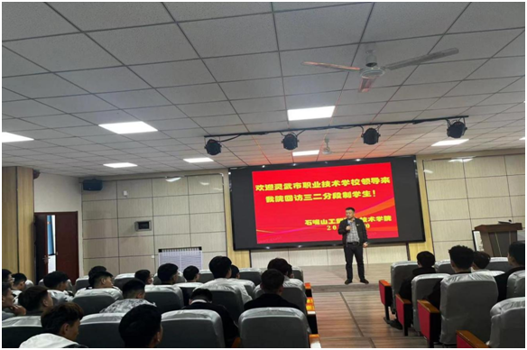 趙校長一行首先看望了靈武市職業(yè)技術(shù)學(xué)校首批“三二分段”合作辦學(xué)轉(zhuǎn)段到我校就讀的41名學(xué)生,了解了學(xué)生的生活、學(xué)習(xí)等情況,要求學(xué)生要珍惜大學(xué)時(shí)光,認(rèn)真學(xué)習(xí),努力奮斗,成就精彩人生。趙校長表示,學(xué)院擁有雄厚的辦學(xué)實(shí)力,優(yōu)良的教師隊(duì)伍及成熟的辦學(xué)模式,雙方自2020年開展三二分段”培養(yǎng)中高職合作辦學(xué)以來,已為172名學(xué)生提供了學(xué)歷提升的平臺,希望兩校繼續(xù)強(qiáng)化“三二分段”合作辦學(xué),以高職為引領(lǐng),中職為基礎(chǔ)深化交流,共促發(fā)展。張沖副院長就學(xué)院辦學(xué)整體情況、招生就業(yè)、校企合作、課程體系銜接等方面向趙校長一行做了詳細(xì)介紹。她指出兩校要趁著職業(yè)教育的東風(fēng),持續(xù)加強(qiáng)院校合作,落實(shí)中高職業(yè)教育的新政策。