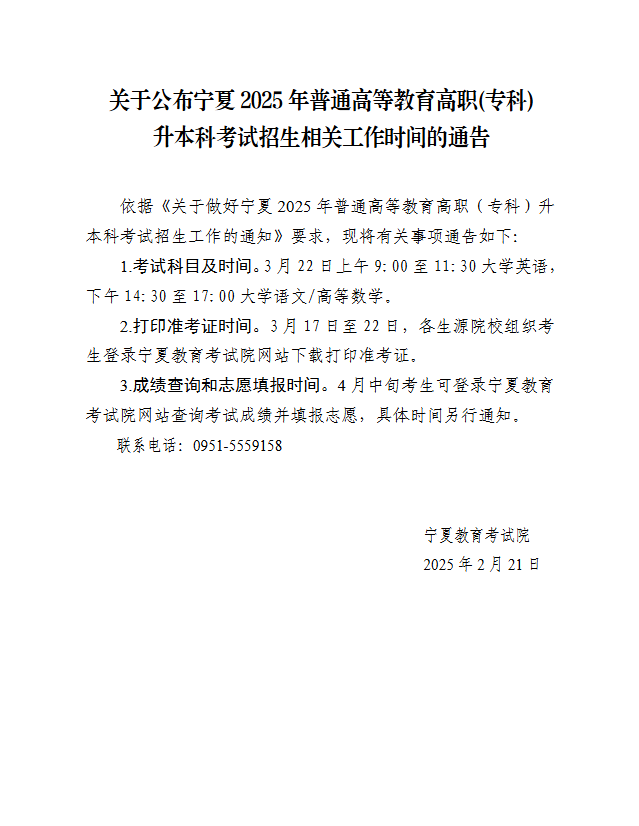 關(guān)于公布寧夏2025年普通高等教育高職(??疲┥究瓶荚囌猩嚓P(guān)工作時(shí)間的通告