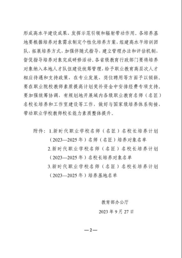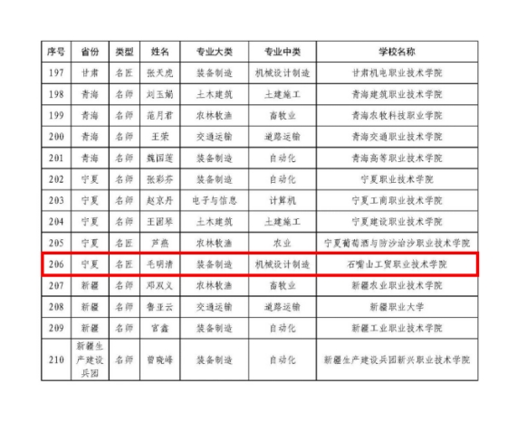 近日,教育部辦公廳下發(fā)《關(guān)于公布新時代職業(yè)學校名師(名匠)名校長培養(yǎng)計劃(2023-2025年)培養(yǎng)對象和培養(yǎng)基地名單的通知》(教師廳函〔2023〕23號),機械工程系教師毛明清成功入選高等職業(yè)院校名師(名匠)培養(yǎng)對象210人名單。