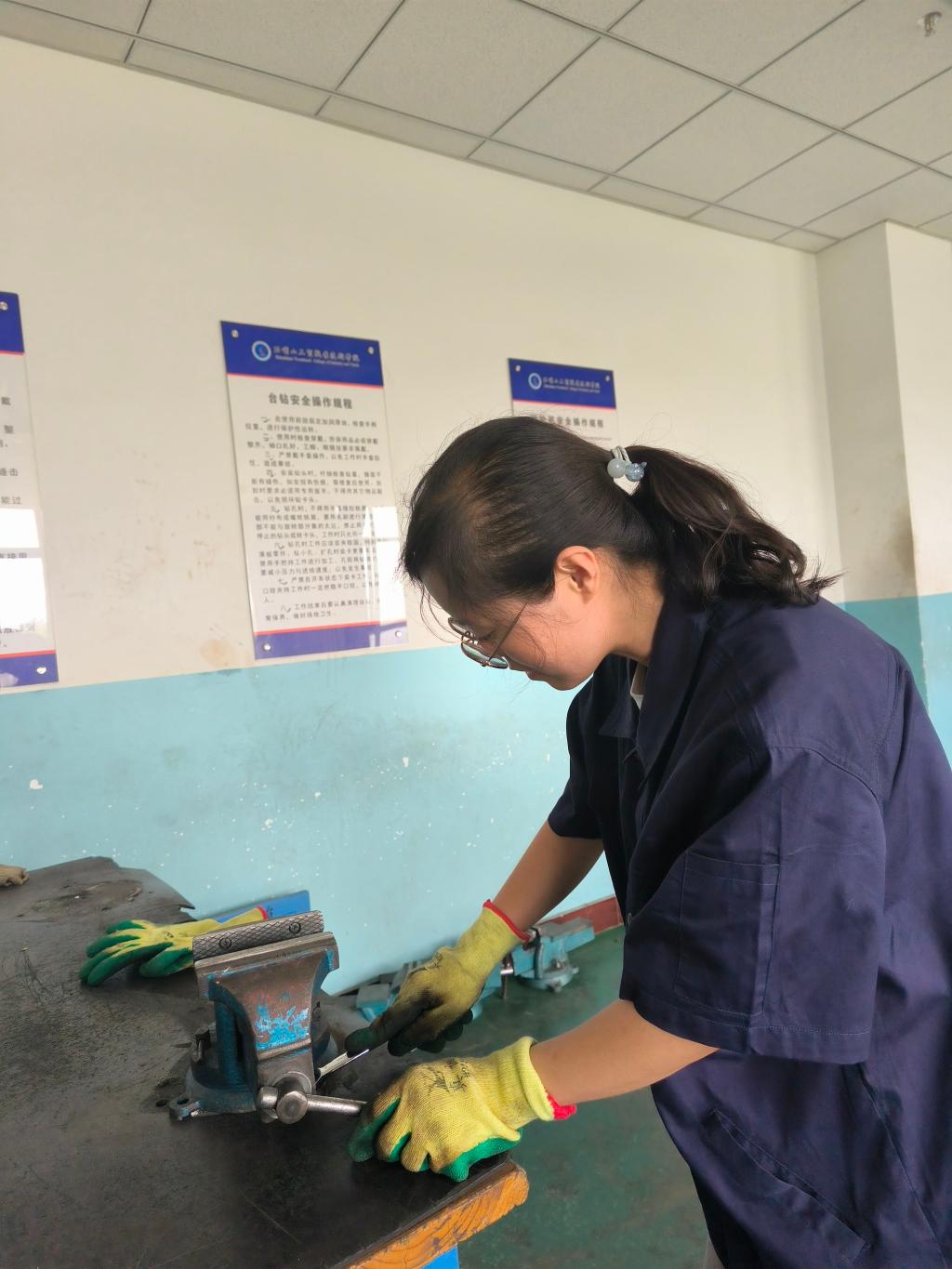 此外,幾位女同志也不甘示弱。慕承娟拆卸臺虎鉗,將卸下的螺絲釘和螺帽歸類放好,將一臺臺臺虎鉗搬運至實訓室墻角。鐘美用電動螺絲刀把螺絲釘釘進鋼條中,將角鐵與工作臺組裝到一起,提升了工作臺的牢固程度。此外,他們還對角鐵進行測量劃線,將實訓室的衛(wèi)生清掃干凈。