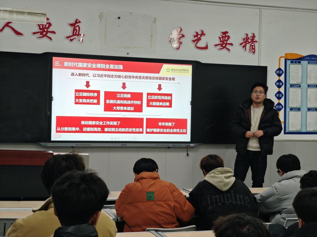 龐得利老師強調國家安全是安邦定國的重要基石,維護國家安全是全體人民的共同責任。結合當前國際國內安全形勢,他簡要解讀了總體國家安全觀的核心要義,重點闡明黨對國家安全工作的絕對領導是根本保證,強化風險意識,樹立底線思維,主動排查身邊潛在安全風險,做到防患于未然;主動擔當作為,既要當好國家安全的守護者和宣傳者,更要將安全理念融入日常,以實際行動踐行國家安全責任。