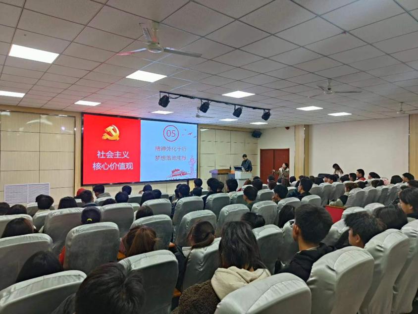 活動中,王貞妮老師圍繞社會主義核心價值觀的發(fā)展歷程、如何理解社會主義核心價值觀兩個方面,結合學習和生活中的感悟,與同學們進行了深入交流,并且給同學們解讀了社會主義核心價值觀在國家、社會、公民三個層面的不同內涵,同時對同學們作出要求:希望同學們在成長成才的過程中,養(yǎng)成良好的道德行為規(guī)范,從身邊的小事做起,踐行社會主義核心價值觀,在學校做一個好學生,在社會上做一個有擔當、有責任感的好公民,大學畢業(yè)后成為有擔當和責任感的社會棟梁。