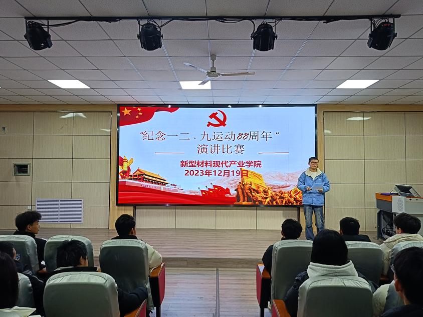 為深入貫徹落實習(xí)近平新時代中國特色社會主義思想和黨的二十大精神,紀(jì)念“一二·九”運動88周年,引導(dǎo)廣大青年學(xué)生聽黨話,跟黨走,在落實立德樹人根本任務(wù)中培育和踐行社會主義核心價值觀,新型材料現(xiàn)代產(chǎn)業(yè)學(xué)院團總支于2023年12月19日在3號樓報告廳組織開展了以 “青春有為逢盛世,接續(xù)奮斗如其實”為主題的紀(jì)念“一二·九”愛國運動演講比賽。