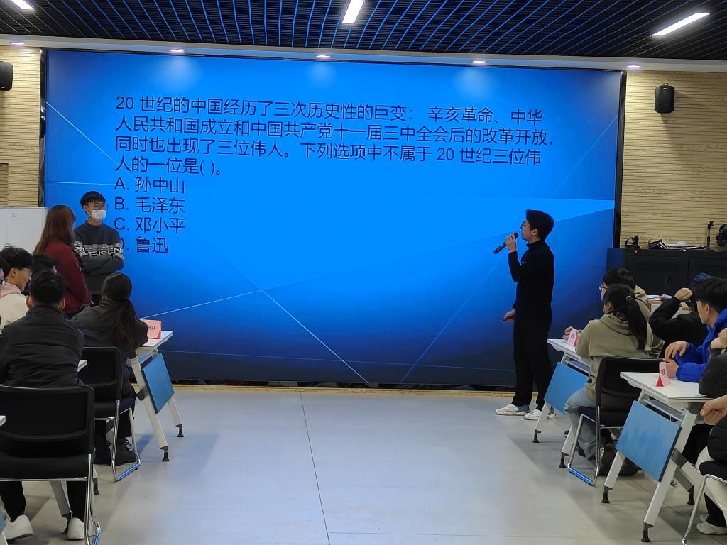 為深入學(xué)習(xí)貫徹落實習(xí)近平新時代中國特色社會主義思想,把黨的二十大精神、愛國主義教育等內(nèi)容融入教學(xué),以思想政治理論課教學(xué)與實踐活動相結(jié)合,通過開展豐富的校園文 化生活,進(jìn)一步營造濃厚學(xué)習(xí)氛圍,推動學(xué)院“五育并舉”“三 全育人”“三進(jìn)”工作走深走實,引導(dǎo)廣大學(xué)子增強文化自覺, 堅定文化自信,激發(fā)大學(xué)生的愛國情、強國志,馬克思主義學(xué)院特舉辦凝心鑄魂強根基團結(jié)奮進(jìn)新征程暨第一屆“筑牢思想、強國有我”知識比賽活動。馬克思主義學(xué)院教師指導(dǎo)青年馬克思主義宣講社團于12月20日在11號樓116教室舉辦“筑牢思想、強國有我”知識比賽。