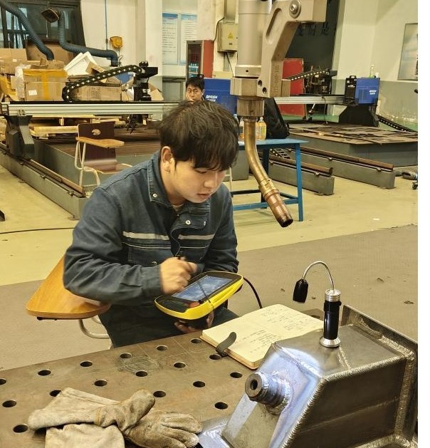 智能焊接技術(shù)賽項由焊接團隊黨員教師吳玉鵬、黨永豐指導(dǎo)訓(xùn)練。5月16日,黨永豐帶領(lǐng)備賽學(xué)生前往威海市榮成市威海海洋職業(yè)學(xué)院進行智能焊接技術(shù)賽項拉練?!霸诩?xùn)期間,我們團隊深深感受到了國賽激烈的競賽氛圍,威海市榮成市威海海洋職業(yè)學(xué)院在設(shè)備操作上對我們的參賽學(xué)生進行了指導(dǎo),讓我們收獲了很多比賽技巧,提高了實戰(zhàn)能力,有力振奮了我們參賽團隊的精氣神?!秉h永豐說。