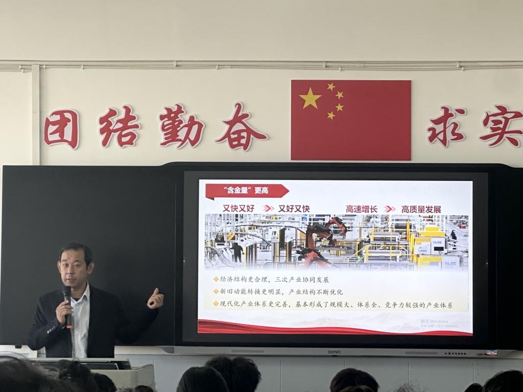 授課中,劉超書記用層層遞進(jìn)的方式,注重引導(dǎo)啟發(fā),結(jié)合世情、國情、區(qū)情、校情、學(xué)情,運(yùn)用豐富的案例、準(zhǔn)確的數(shù)據(jù)、生動(dòng)的闡釋進(jìn)行了接地氣、有溫度、有針對(duì)性的精彩講授。課堂內(nèi)容講述了偉大祖國從積貧積弱到世界第二大經(jīng)濟(jì)體,經(jīng)濟(jì)實(shí)力、綜合國力和國際影響力實(shí)現(xiàn)歷史性跨越引入授課主題;講述了國家發(fā)展從瓶頸制約到優(yōu)勢支撐,基礎(chǔ)產(chǎn)業(yè)和基礎(chǔ)設(shè)施空前加強(qiáng);講述了我國從封閉半封閉到高水平開放,對(duì)外開放取得舉世矚目的偉大成就;講述了國家從單一失衡到優(yōu)化升級(jí),經(jīng)濟(jì)結(jié)構(gòu)實(shí)現(xiàn)歷史性變革;講述了我們從發(fā)展落后到創(chuàng)新引領(lǐng),創(chuàng)新型國家建設(shè)成果豐碩;講述了人民從溫飽不足到全面小康,人民生活發(fā)生翻天覆地變化;講述了社會(huì)發(fā)展過程從相對(duì)滯后到全面進(jìn)步,各項(xiàng)社會(huì)事業(yè)欣欣向榮;講述了發(fā)展之路從生態(tài)失衡到綠色發(fā)展,生態(tài)文明建設(shè)發(fā)生歷史性、轉(zhuǎn)折性、全局性變化。