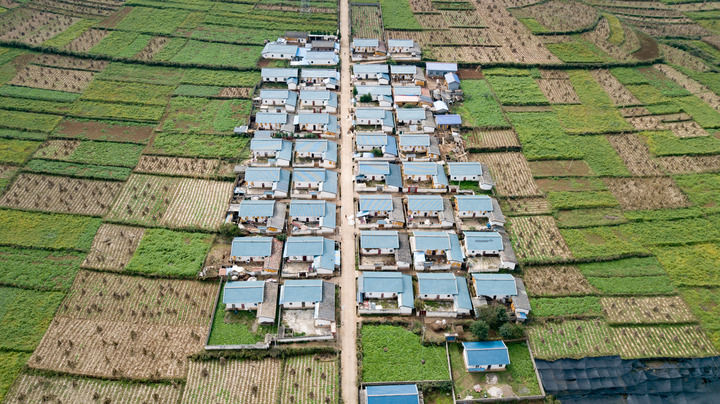 俯瞰四川省昭覺縣地莫鄉(xiāng)地莫村田園中的新居(2020年10月10日攝,無人機照片)。